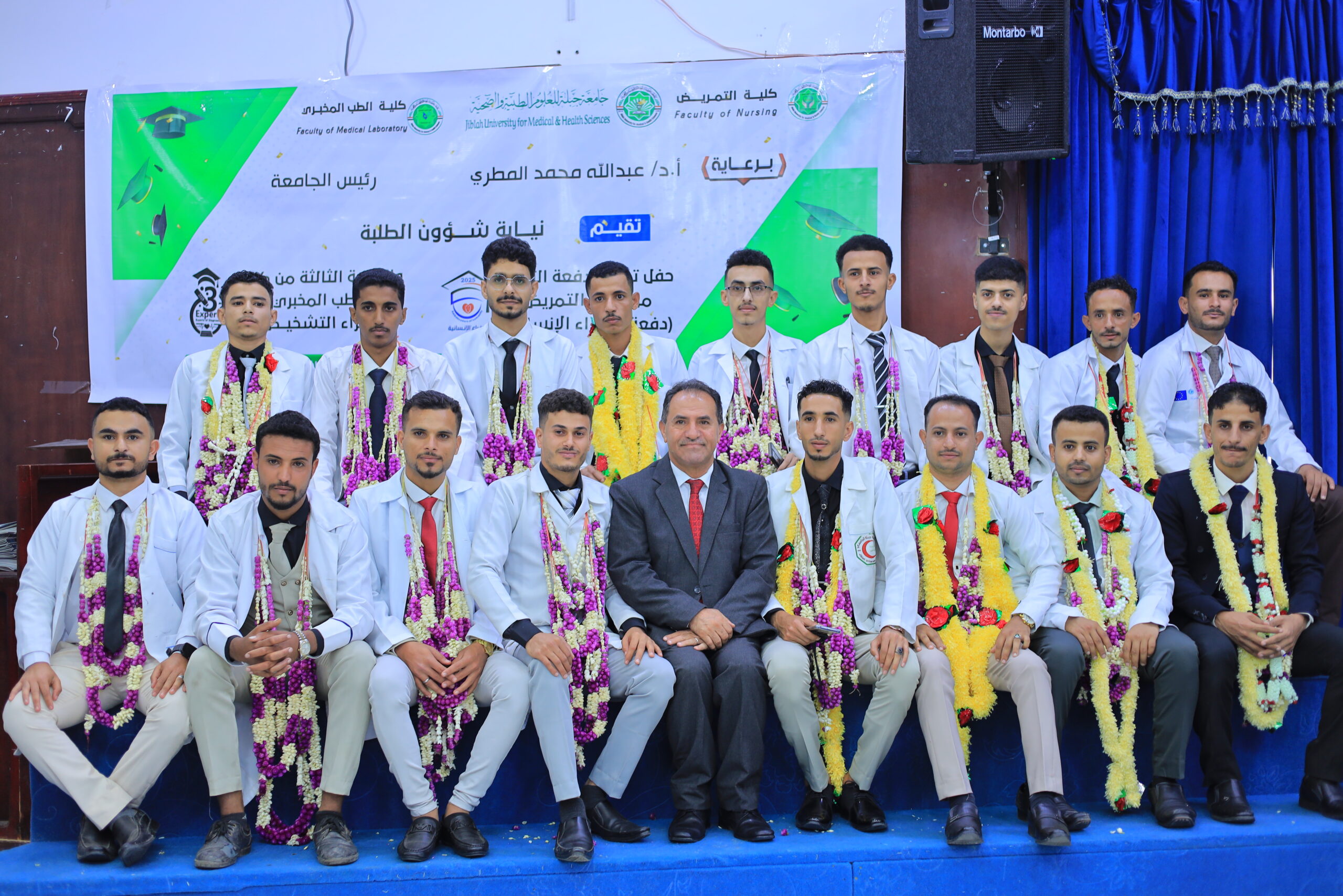 برعاية رئيس الجامعة الأستاذ الدكتور عبدالله محمد المطري، احتفلت جامعة جبلة للعلوم الطبية والصحية صباح اليوم الثلاثاء الموافق 14 أكتوبر 2025م بتخرج الدفعة الثالثة من طلبة كليتي التمريض والطب المخبري، في قاعة 22 مايو ، وبحضور الأستاذ الدكتور صادق المحني القائم بأعمال النائب للشؤون الاكاديمية والدراسات العليا ، ود/ محمد الهتار القائم بأعمال النائب لشؤون الطلبة ، والأستاذ الدكتور أحمد الحزمي عميد كلية الطب المخبري ، ود/ عبدالحكيم الصبان عميد كلية الصيدلة ود/ عبدالله الورافي مستشار رئيس الجامعة وأعضاء هيئة التدريس، و إلى جانب الأخ أبو زيد الشاجع مدير عام المديرية ، وجمع من أولياء الأمور والضيوف.